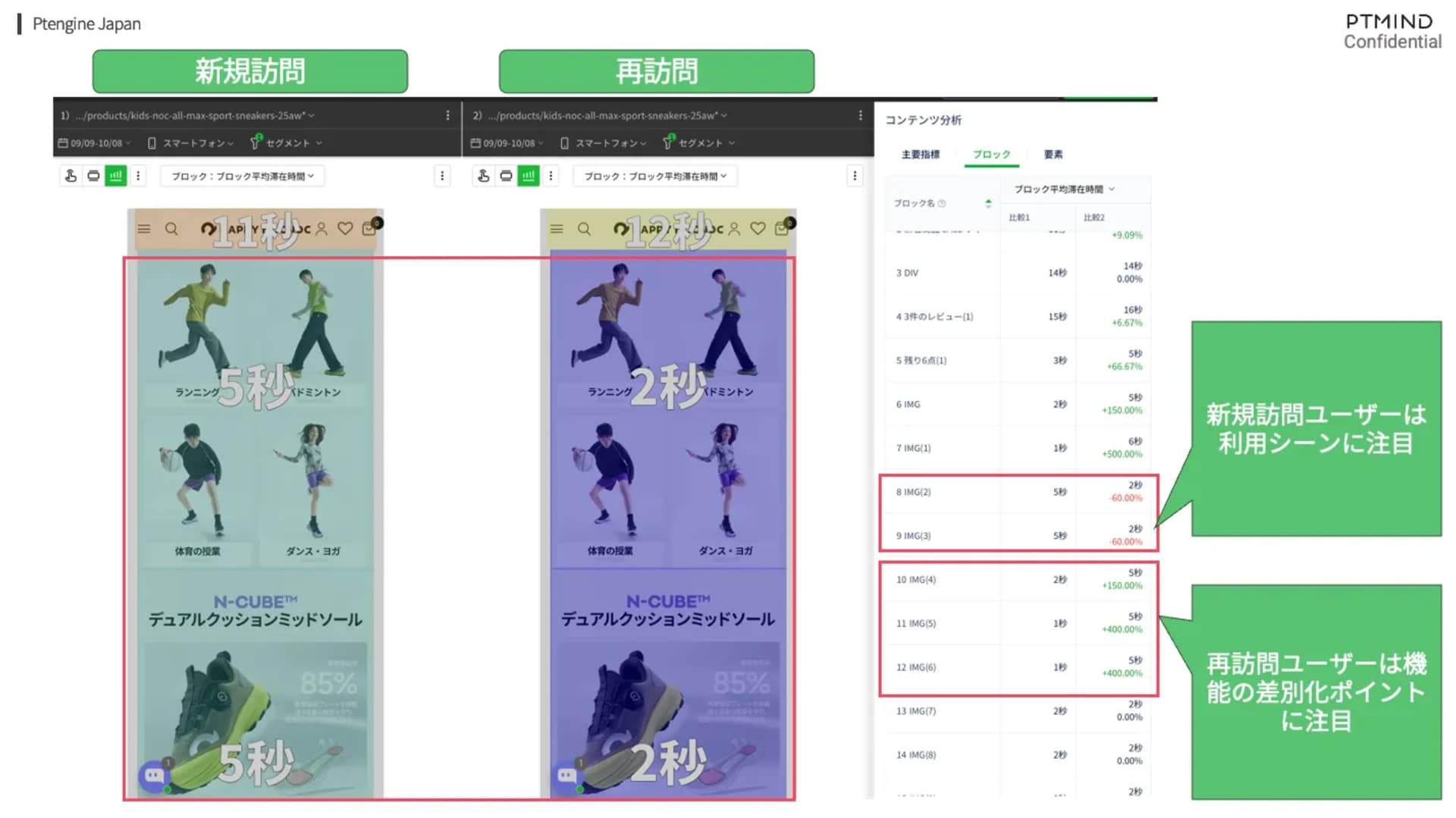例えば、新規ユーザーと再訪問ユーザーの比較において、再訪問ユーザーは「機能面」を打ち出しているブロックを長く見ているが、新規ユーザーはどのような場面でするのか「利用シーン」を注目しており、顕著な差が確認でたとします。