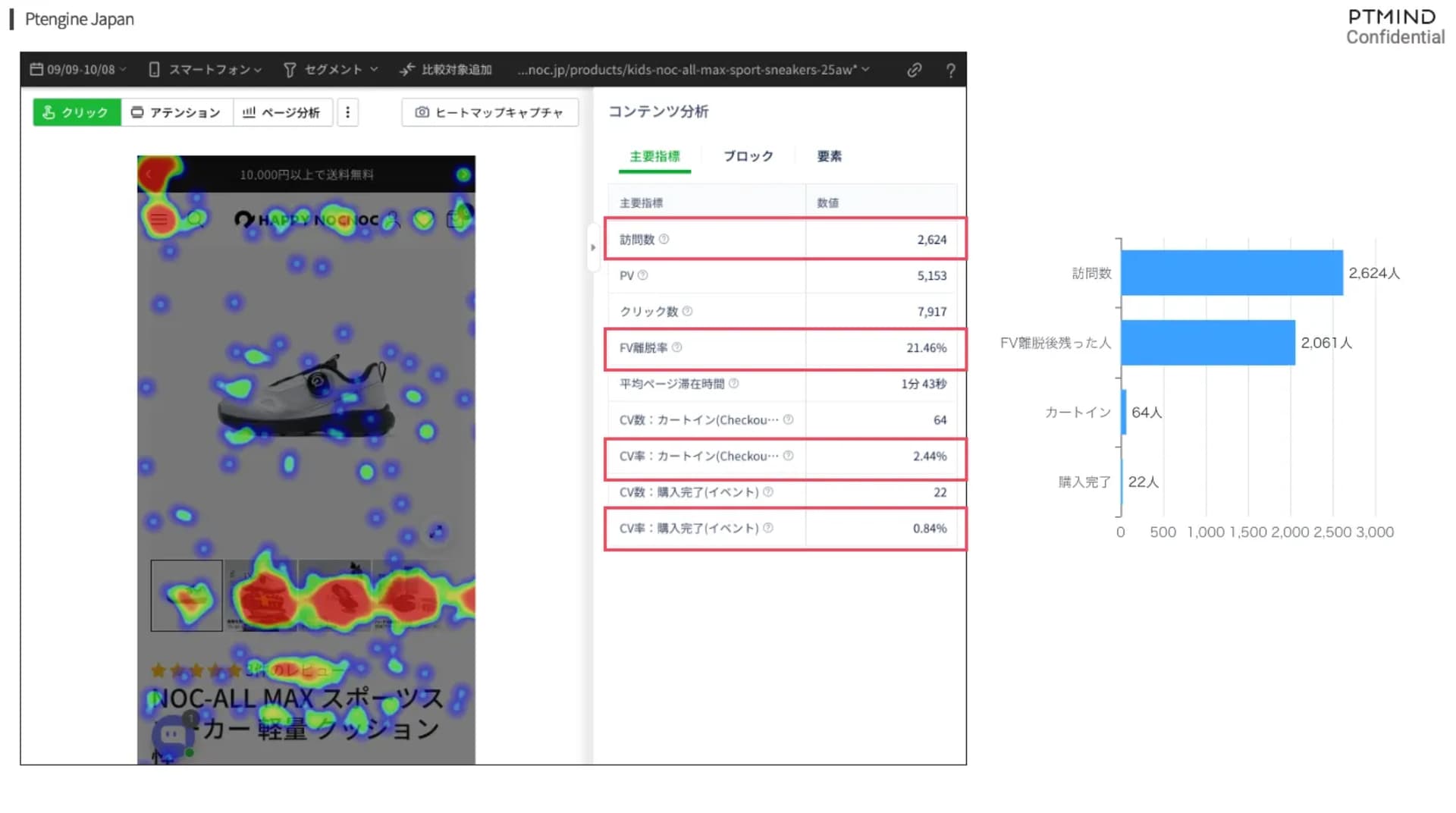 主要指標画面では、このページを訪問したユーザーが、設定した中間コンバージョン(例:カートイン)や最終ゴール(購入完了)にどれだけ到達したかというパフォーマンスを見ることができます。このファネルを観察することで、問題のボトルネックがどこにあるのかを明確に特定します。