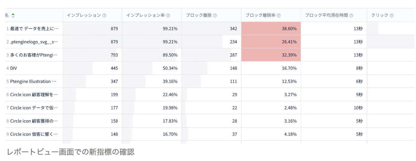 ブロック離脱率 | そのブロックが表示された(インプレッション)セッションのうち、その場所でセッションが終了した(離脱した)割合。 | ユーザーが関心や情報収集を諦めたポイント(関心の終了)を特定する。 | PVベースの指標です。母数が対象ページのPVであり、インプレッションは1PVにつき1以上カウントされません。 |