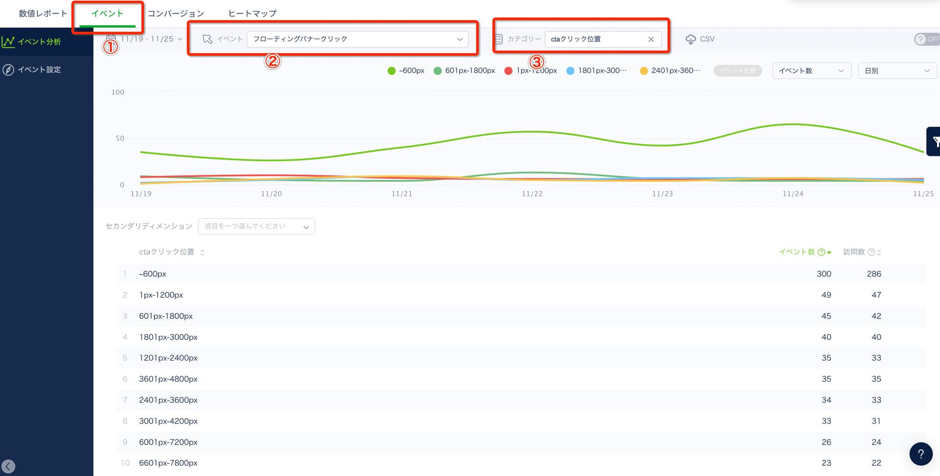 ①イベント分析画面へ→②対象のイベントを選択→③カテゴリから確認したいデータを選択