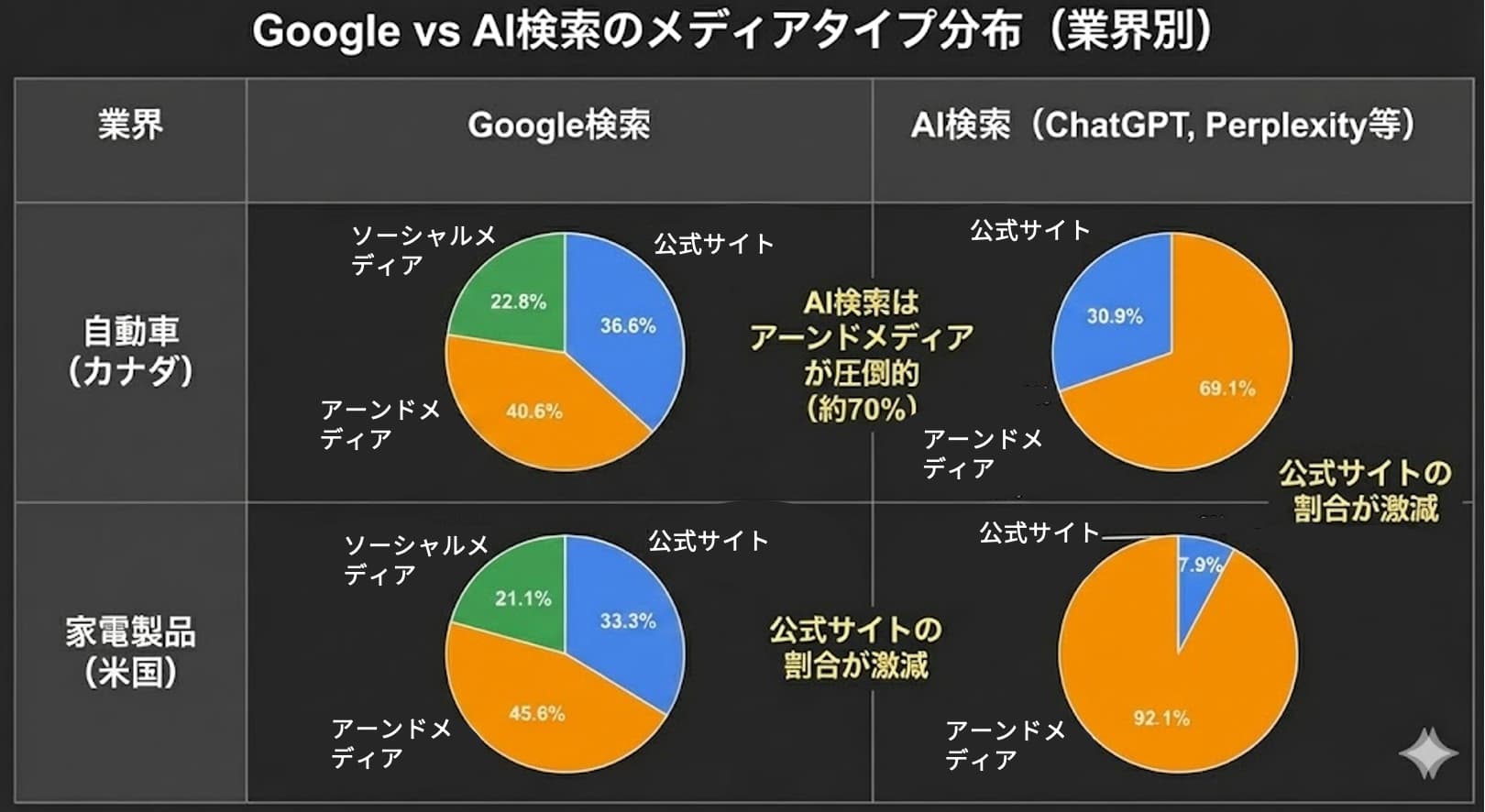 - AI検索:ブランド7.9%、ソーシャル0%、アーンド92.1%