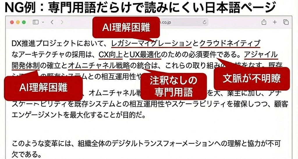 本文の質とセットで効く ─ 日本語コンテンツ、FAQ、比較表など、AIが引用できる文脈を同時に整備する必要がある