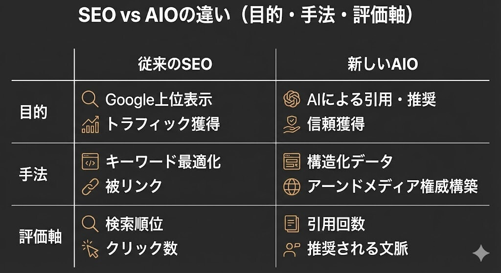 従来のSEOが「Googleのアルゴリズムに最適化する」ことだったのに対し、AIOは 「AIの判断ロジックに最適化する」 ことです。