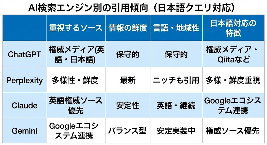 - 日本語クエリでも英語圏の権威メディアを参照する傾向