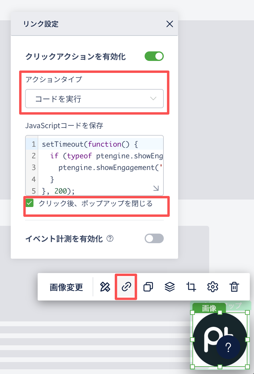 Step 3 のポップアップのクリックアクションコードの中に step2の表示タイミングで保存しておいた